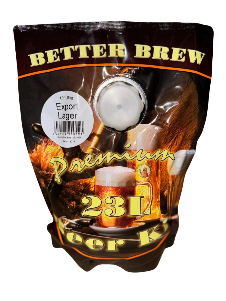 Better Brew Export Lager je kvalitní mladinový koncentrát určený pro snadnou výrobu až 23 litrů světlého ležáku v domácích podmínkách. Tento koncentrát je již hotový, takže Vám odpadá nutnost vaření nebo chmelovaru - stačí ho pouze rozmíchat s vodou, přidat kvasný cukr nebo sladový výtažek a zakvasit přiloženými svrchními pivovarskými kasnicemi.